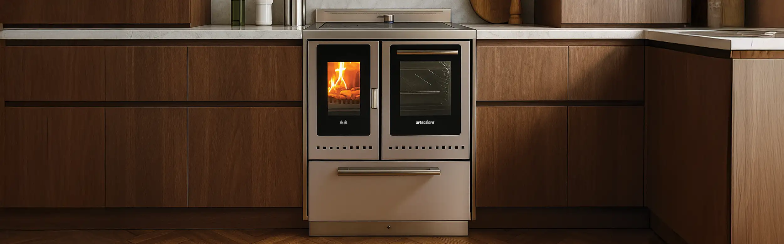 Grâce à son mécanisme à cliquet et ses charnières servo-assistées robustes, la porte du foyer s’ouvre et se ferme avec fluidité. Associée au système à bascule de la porte du four, elle garantit confort d’utilisation et sécurité maximale.